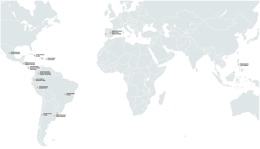 To understand the initiative that gave rise to the maturity model analyzed in this article, it is necessary to situate it within the institutional framework of the Iberarchivos Program. Created in 1998, the program is a cooperative alliance among 17 national archival institutions in Ibero-America: the Archivo General de la Nación of Argentina; the Archivo Nacional of Brazil; the Archivo Nacional of Chile; the Archivo General de la Nación of Colombia; the Archivo Nacional of Costa Rica; the Archivo General de la Nación of Cuba; the Archivo Histórico Nacional of Ecuador; the Archivo Histórico Nacional of El Salvador; the Subdirección General de los Archivos Estatales of España; the National Archives of the Philippines; the Archivo General de la Nación of México; the Archivo Nacional of Panamá; the Archivo General of Perú; the Directorate-General for Books, Libraries, and Archives of Portugal; the Archivo General de la Nación of Puerto Rico; the Archivo General de la Nación of the Dominican Republic; and the Archivo General de la Nación of Uruguay (Figure 1).