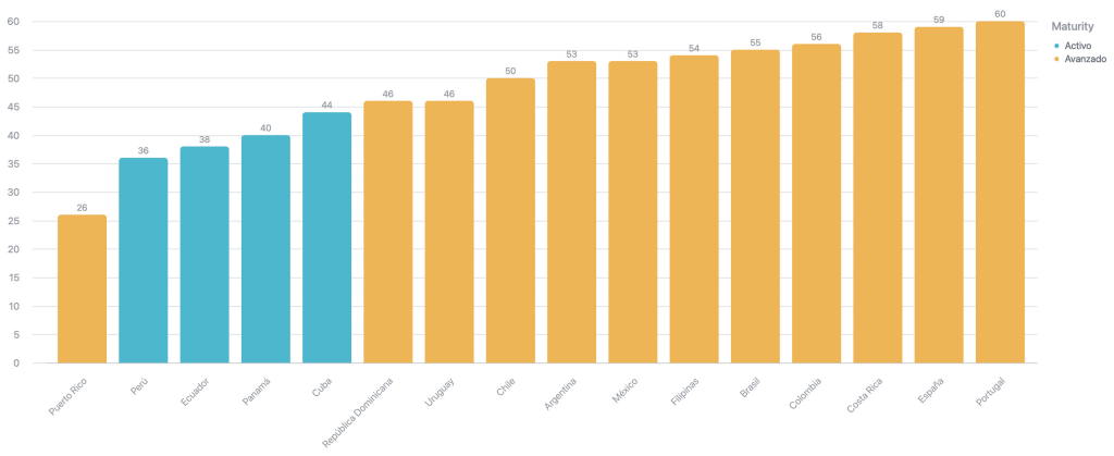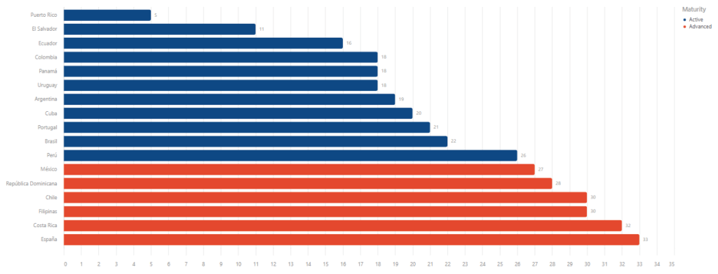 The institutions with higher maturity levels are the Subdirección General de los Archivos Estatales of Spain, the National Archive of Costa Rica, the National Archives of the Philippines, the National Archive of Chile, the Archivo General de la Nación of the Dominican Republic, the Archivo General de la Nación of México, and the Archivo General de la Nación of Peru. With scores ranging from 26 to 32, these institutions have developed solid policies in training, legislation, and strategic partnerships, serving as benchmarks for the others.