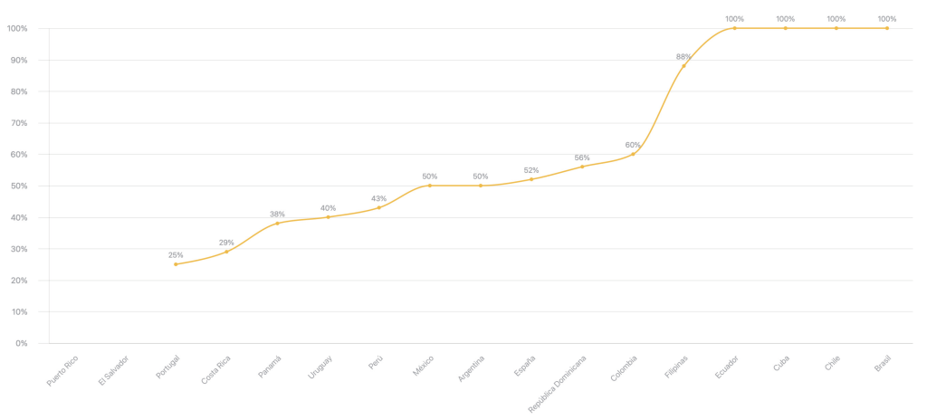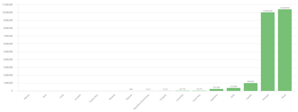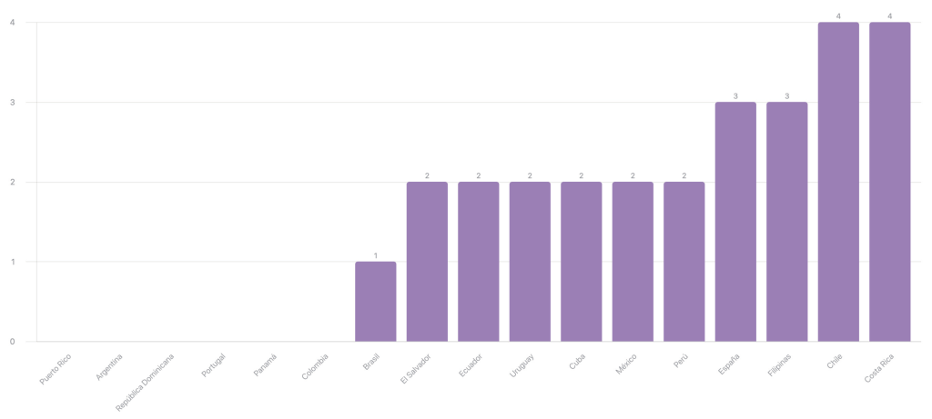 Online visit volumes constitute another key indicator: Spain exceeded 20 million visits in 2022, Brazil and Portugal over 10 million, while Chile and Argentina recorded between 200,000 and 300,000. In contrast, countries like Uruguay and the Dominican Republic reported between 3,000 and 6,000, and the Philippines only 490. This disparity highlights significant differences in the level of digitization and accessibility of documentary holdings (Figure 3).