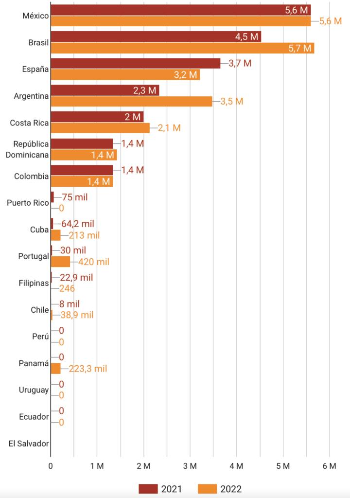 The digitization policy shows uneven development, although it demonstrates a positive trend. Except for Costa Rica, all institutions reported an increase in digitized documents between 2021 and 2022. Cuba reported 2.13 million documents in 2022, Spain exceeded 3.2 million, and Brazil surpassed 5 million (Figure 4).